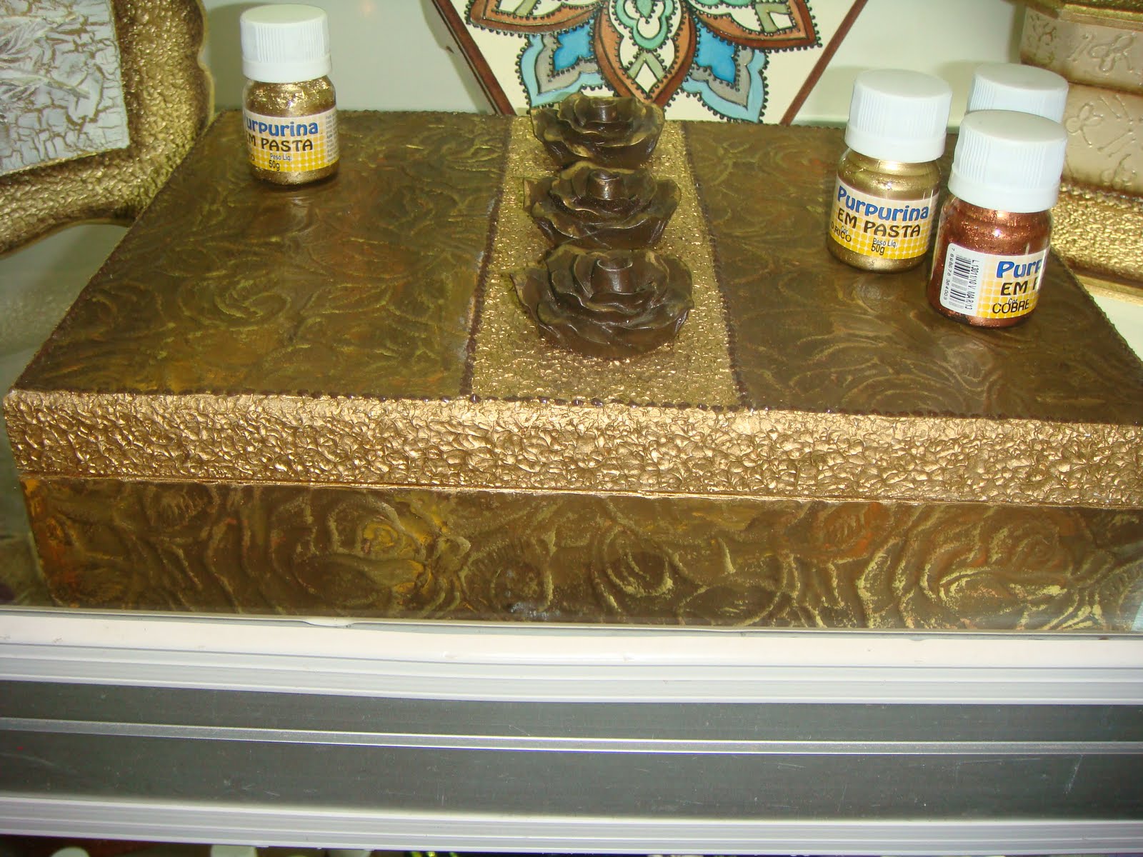 CAIXA EM MDF COM TEXTURA E ACABAMENTO COM PURPURINA EM PASTA