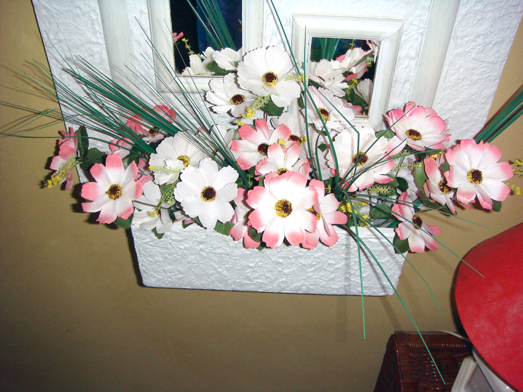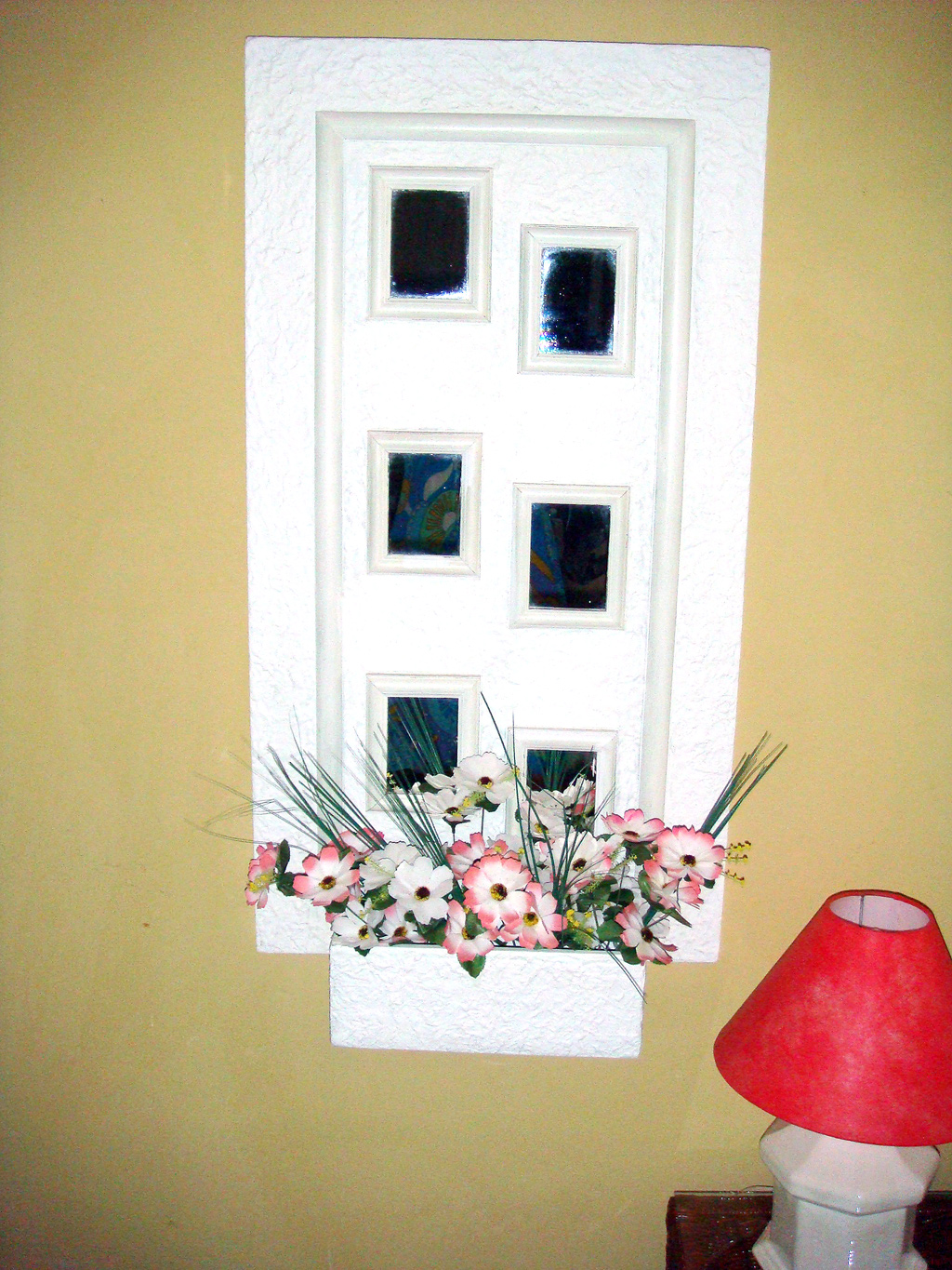 Uma porta velha e alguns espelhos, transformei em uma  peça de decoração com direito a floreira e tudo !