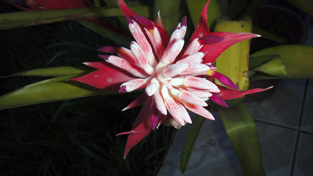 Na segunda feira quando sai de casa a minha bromélia estava sem flor, quando retornei na quarta feira, ela estava maravilhosa multicolorida repleta de flores.