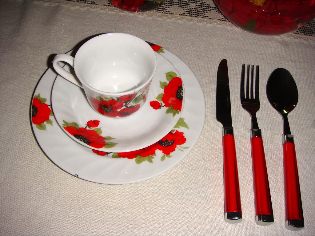 Gente quinta fera passada fui garimpar e olha o que encontrei! Eu gosto muito de louça colorida e quando vi, essas xícaras com flores vermelhas não resisti. E agora estou postando para todas as minhas queridas amigas que gostam do vermelho na mesa.
